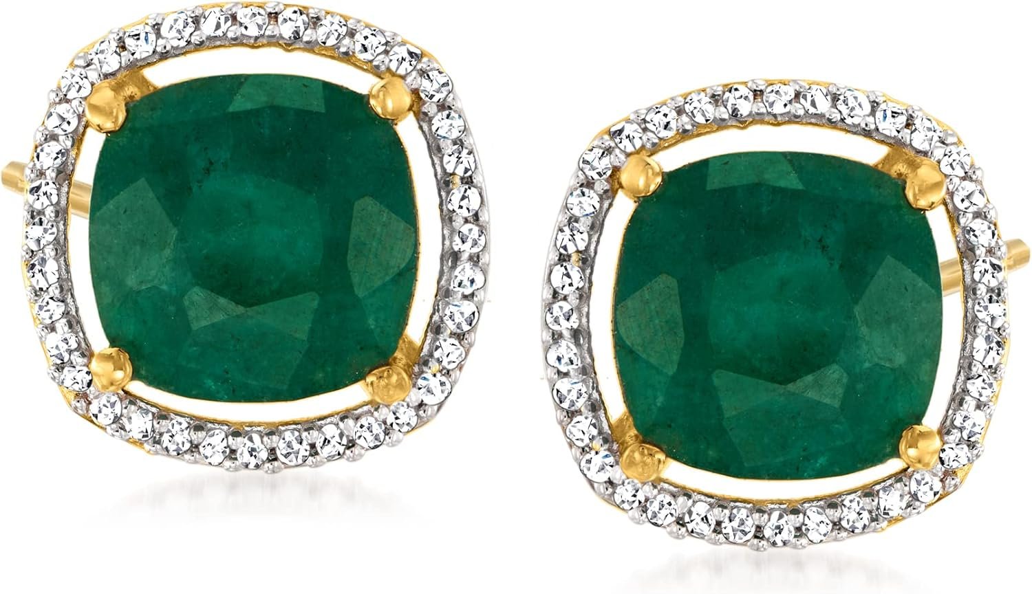 - Square shape green emerald and single-cut round diamond. Polished 18kt yellow gold over sterling silver.