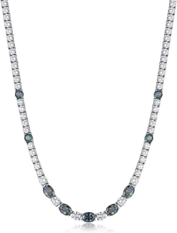 - ❴♥Classic Luxury Tennis Necklace with Birthstone♥ ❵ This 18″ tennis necklace features round 4mm Cubic Zirconia stones in four-prong settings, decorated with four 5mm round Created Alexandrite and five 6*8mm oval Created Alexandrite. Unique and Luxury. There are 12 different color’s gemstones corresponding to the birthstone of each month.