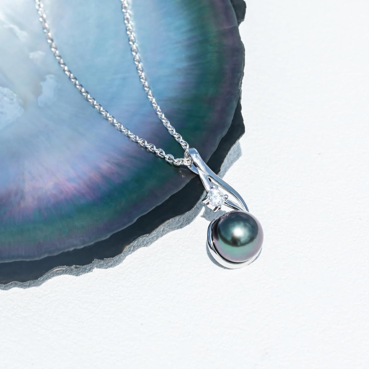 Tahitian Black Pearl Necklace, 9-11mm AAAA Quality Handpicked Tahitian Black Pearls, D Color Moissanite, Sterling Silver / 10K Solid White Gold, 45+2+3mm Adjustable Chain